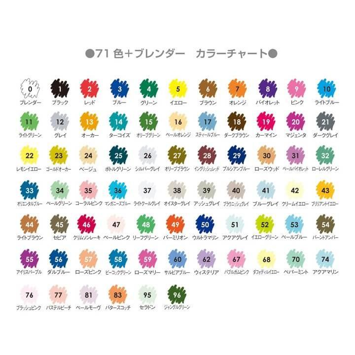 鮮やかな、71色のカラーと専用ブレンダーを揃えた細筆カラーマーカー。