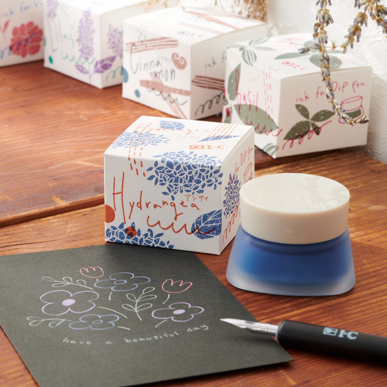 アイシーから『てがきを楽しむ』ことをコンセプトにした『てがき時間』シリーズのインク新色が誕生しました。大人気の『くすみカラー』5色・アジサイをイメージしたブルーベースのインク色です。