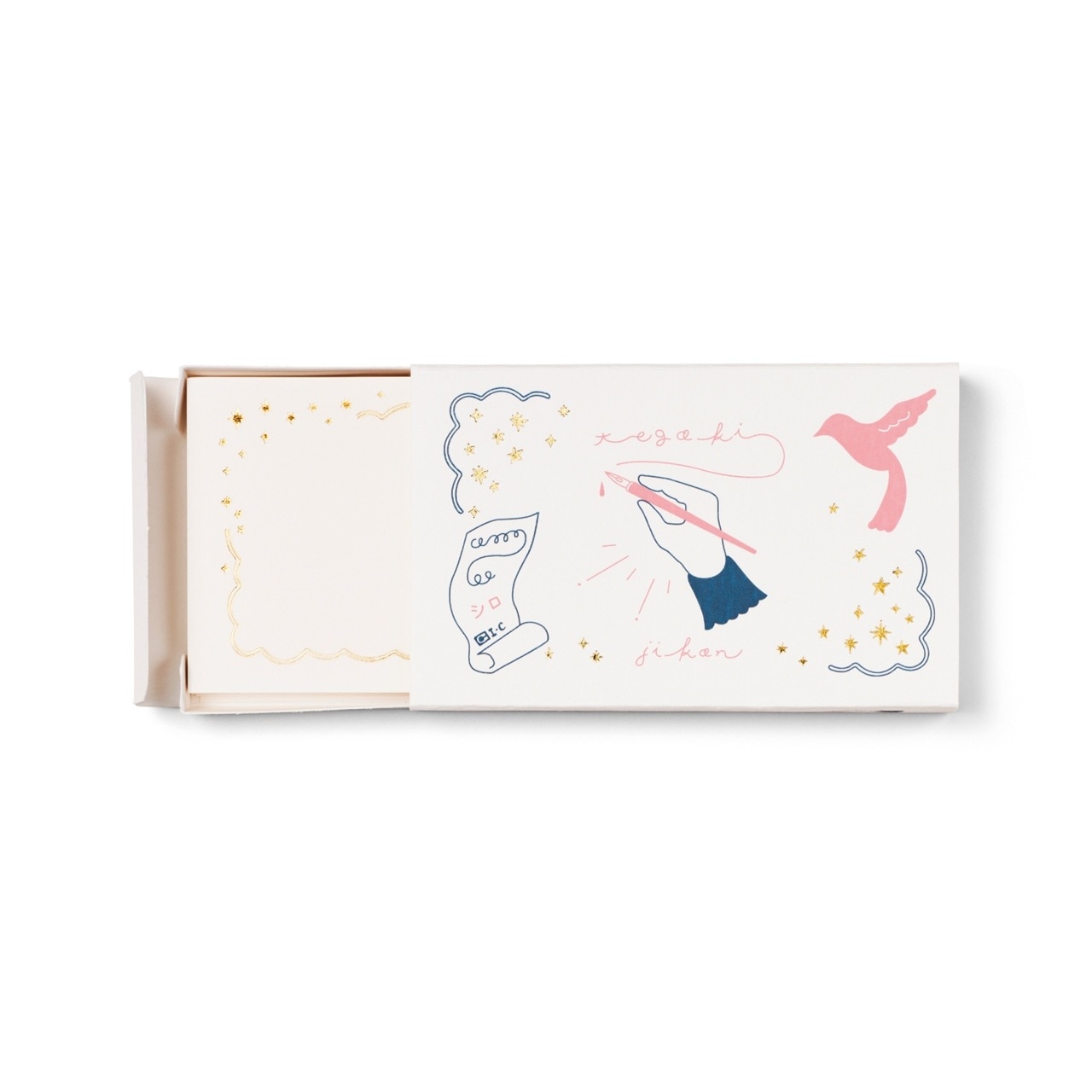 飾り枠が箔押しされた名刺サイズのカードがスライド式のボックスに入っています。